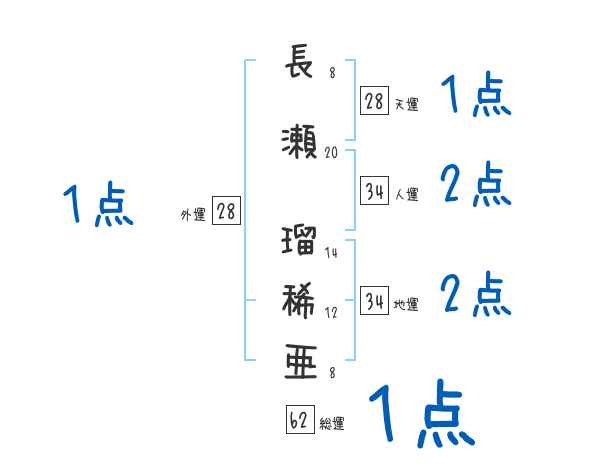 天運![]() | 長瀬瑠稀亜さんの天運は28画の1つ星!家庭環境に注意。スポーツで活躍できる能力があるかも。 家系が持つ宿命的な運勢を表します。祖先から受け継いだ苗字ですので自分の力が及びません。家柄を象徴します。 |
