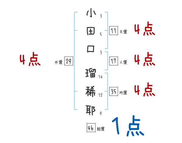 外運![]() | 小田口瑠稀耶さんの外運は29画の4つ星!完全主義で才能がある。厳格な心の持ち主。 生活面を象徴する運勢です。外部から受ける影響力を表し、結婚運、家庭運や職場、環境への順応性を表します。 |