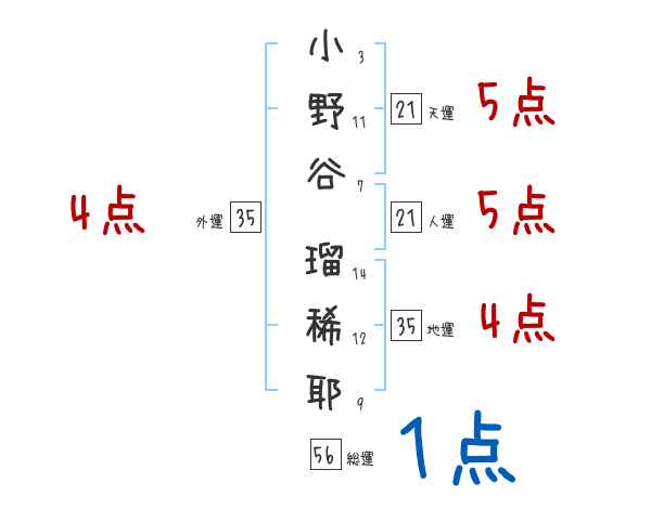 外運![]() | 小野谷瑠稀耶さんの外運は35画の4つ星!温厚な性格で感受性が高い。穏和な性格で人望が厚い。 生活面を象徴する運勢です。外部から受ける影響力を表し、結婚運、家庭運や職場、環境への順応性を表します。 |