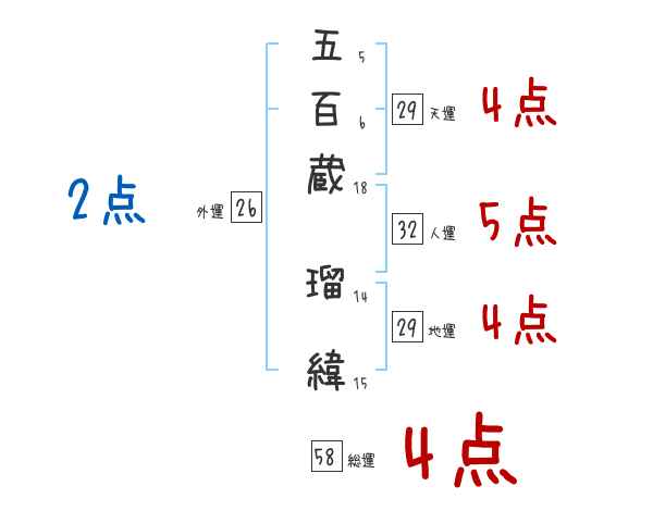 人運![]() | 五百蔵瑠緯さんの人運は32画の5つ星!柔軟性があり成功する。チャンスが多く金運が良い。 性格や才能などを表す2番目に重要な運勢です。人間関係や協調性、社会的な成功に影響します。主に20歳から50歳ぐらいまでの中年期の運勢を表します。 |