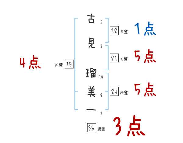 総運![]() | 古見瑠美一さんの総運は36画の3つ星!先見性が豊かです。多少神経質で苦労することも。 あなたの人生を表す1番重要な運勢です。生涯を通じて影響する総合運となり、主に50歳以降の晩年期に影響を及ぼします。 |