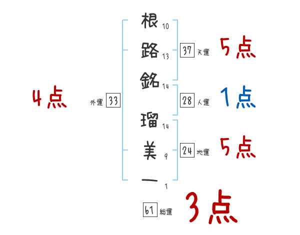 外運![]() | 根路銘瑠美一さんの外運は33画の4つ星!権力志向でプライドが高い。勇気があり運を切り開き成功する。 生活面を象徴する運勢です。外部から受ける影響力を表し、結婚運、家庭運や職場、環境への順応性を表します。 |