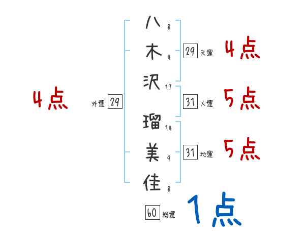 天運![]() | 八木沢瑠美佳さんの天運は29画の4つ星!完全主義で才能がある。厳格な心の持ち主。 家系が持つ宿命的な運勢を表します。祖先から受け継いだ苗字ですので自分の力が及びません。家柄を象徴します。 |