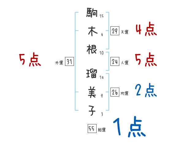 天運![]() | 駒木根瑠美子さんの天運は29画の4つ星!完全主義で才能がある。厳格な心の持ち主。 家系が持つ宿命的な運勢を表します。祖先から受け継いだ苗字ですので自分の力が及びません。家柄を象徴します。 |