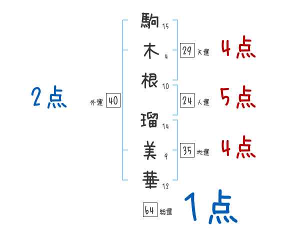 外運![]() | 駒木根瑠美華さんの外運は40画の2つ星!自信過剰で物事に固執するためトラブルに注意。 生活面を象徴する運勢です。外部から受ける影響力を表し、結婚運、家庭運や職場、環境への順応性を表します。 |