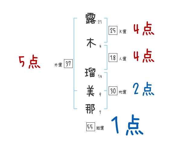 天運![]() | 露木瑠美那さんの天運は25画の4つ星!個性があり才能があふれる。強運の持ち主で発展する。 家系が持つ宿命的な運勢を表します。祖先から受け継いだ苗字ですので自分の力が及びません。家柄を象徴します。 |