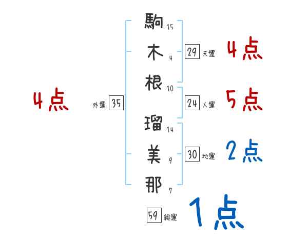 天運![]() | 駒木根瑠美那さんの天運は29画の4つ星!完全主義で才能がある。厳格な心の持ち主。 家系が持つ宿命的な運勢を表します。祖先から受け継いだ苗字ですので自分の力が及びません。家柄を象徴します。 |