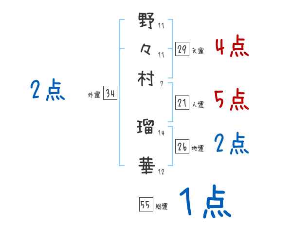 天運![]() | 野々村瑠華さんの天運は29画の4つ星!完全主義で才能がある。厳格な心の持ち主。 家系が持つ宿命的な運勢を表します。祖先から受け継いだ苗字ですので自分の力が及びません。家柄を象徴します。 |