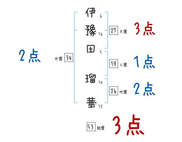 天運![]() | 伊豫田瑠華さんの天運は27画の3つ星!頭脳明晰だが強情で摩擦が多い傾向。孤立に注意。 家系が持つ宿命的な運勢を表します。祖先から受け継いだ苗字ですので自分の力が及びません。家柄を象徴します。 |