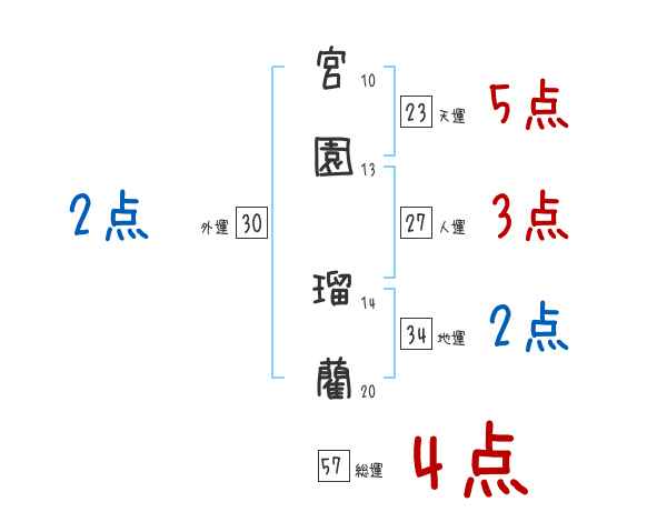 天運![]() | 宮園瑠藺さんの天運は23画の5つ星!想像力に優れ活力がある。一代で成功し名誉を手に入れる。 家系が持つ宿命的な運勢を表します。祖先から受け継いだ苗字ですので自分の力が及びません。家柄を象徴します。 |