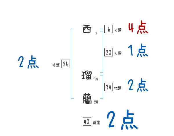外運![]() | 西瑠藺さんの外運は26画の2つ星!波瀾万丈かも。信頼できる人を大事にしましょう。 生活面を象徴する運勢です。外部から受ける影響力を表し、結婚運、家庭運や職場、環境への順応性を表します。 |