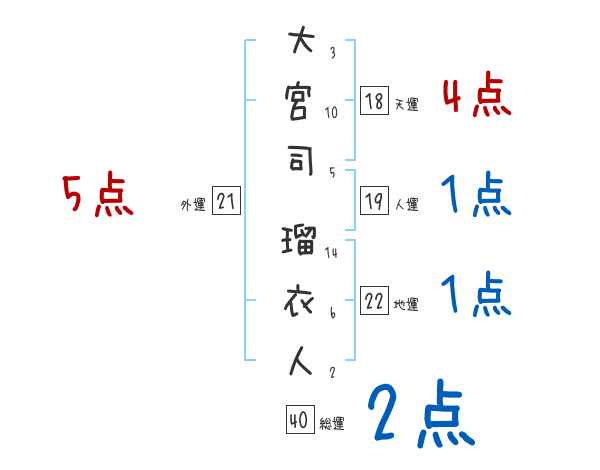 外運![]() | 大宮司瑠衣人さんの外運は21画の5つ星!統率力がある。独立し成功する。名誉を手に入れる。 生活面を象徴する運勢です。外部から受ける影響力を表し、結婚運、家庭運や職場、環境への順応性を表します。 |