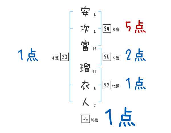 天運![]() | 安次富瑠衣人さんの天運は24画の5つ星!家庭運が良く順調な人生。金運にも恵まれる。 家系が持つ宿命的な運勢を表します。祖先から受け継いだ苗字ですので自分の力が及びません。家柄を象徴します。 |