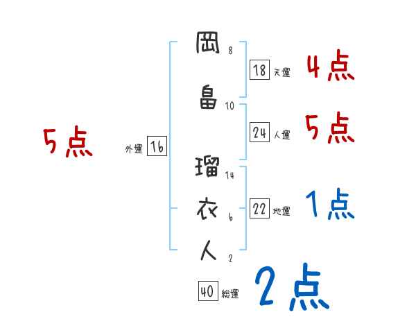 外運![]() | 岡畠瑠衣人さんの外運は16画の5つ星!人望が厚く大きく発展する。逆転成功が見える。 生活面を象徴する運勢です。外部から受ける影響力を表し、結婚運、家庭運や職場、環境への順応性を表します。 |
