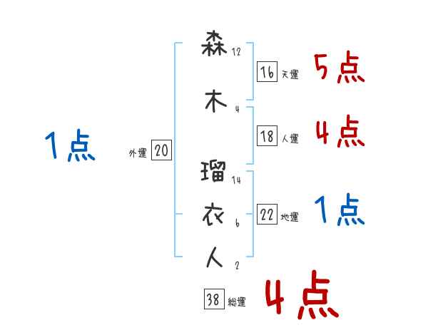 天運![]() | 森木瑠衣人さんの天運は16画の5つ星!人望が厚く大きく発展する。逆転成功が見える。 家系が持つ宿命的な運勢を表します。祖先から受け継いだ苗字ですので自分の力が及びません。家柄を象徴します。 |