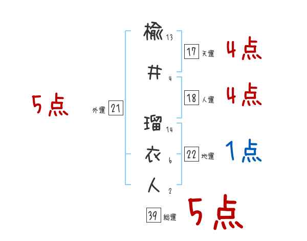 天運![]() | 楡井瑠衣人さんの天運は17画の4つ星!積極的な行動力。地位を気づき財産を手に入れる。純粋な心と直感力。 家系が持つ宿命的な運勢を表します。祖先から受け継いだ苗字ですので自分の力が及びません。家柄を象徴します。 |