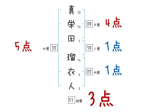 外運![]() | 真栄田瑠衣人さんの外運は32画の5つ星!柔軟性があり成功する。チャンスが多く金運が良い。 生活面を象徴する運勢です。外部から受ける影響力を表し、結婚運、家庭運や職場、環境への順応性を表します。 |