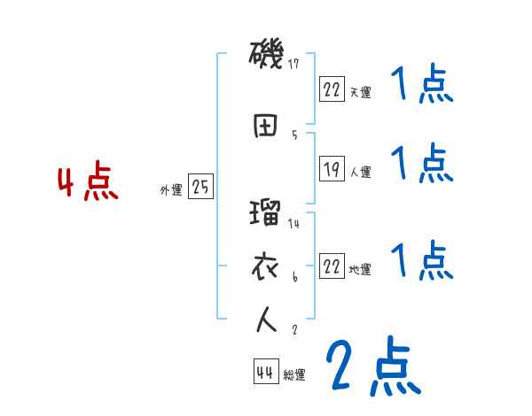 天運![]() | 磯田瑠衣人さんの天運は22画の1つ星!努力することが苦手ないっぽう手先が器用。芸術性にも優れる。 家系が持つ宿命的な運勢を表します。祖先から受け継いだ苗字ですので自分の力が及びません。家柄を象徴します。 |