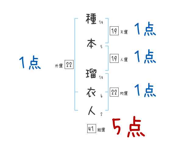 地運![]() | 種本瑠衣人さんの地運は22画の1つ星!努力することが苦手ないっぽう手先が器用。芸術性にも優れる。 個性を表す基礎的な運勢です。性格形成や対人関係、行動力など家庭環境に影響されます。主に誕生してから20歳くらいまでの若年期の運勢を表します。 |
