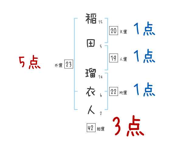 外運![]() | 稲田瑠衣人さんの外運は23画の5つ星!想像力に優れ活力がある。一代で成功し名誉を手に入れる。 生活面を象徴する運勢です。外部から受ける影響力を表し、結婚運、家庭運や職場、環境への順応性を表します。 |