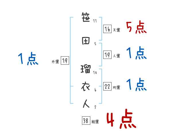 外運![]() | 笹田瑠衣人さんの外運は19画の1つ星!優れた才能を持ちますが、協調性が足りないことも。周りの人と協力する事を意識しましょう。 生活面を象徴する運勢です。外部から受ける影響力を表し、結婚運、家庭運や職場、環境への順応性を表します。 |