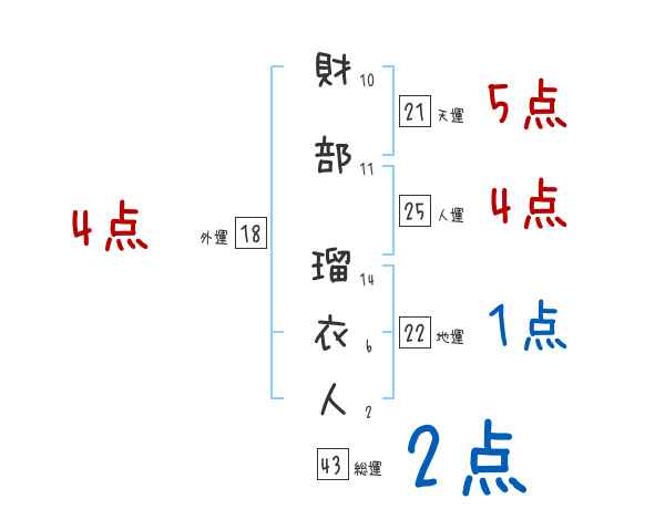 天運![]() | 財部瑠衣人さんの天運は21画の5つ星!統率力がある。独立し成功する。名誉を手に入れる。 家系が持つ宿命的な運勢を表します。祖先から受け継いだ苗字ですので自分の力が及びません。家柄を象徴します。 |