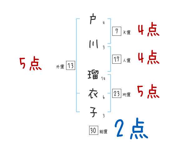 天運![]() | 戸川瑠衣子さんの天運は7画の4つ星!強い意志や信念を持ち独立心が強い。自立する。 家系が持つ宿命的な運勢を表します。祖先から受け継いだ苗字ですので自分の力が及びません。家柄を象徴します。 |