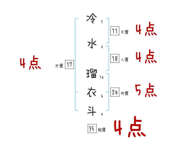 総運![]() | 冷水瑠衣斗さんの総運は35画の4つ星!温厚な性格で感受性が高い。穏和な性格で人望が厚い。 あなたの人生を表す1番重要な運勢です。生涯を通じて影響する総合運となり、主に50歳以降の晩年期に影響を及ぼします。 |