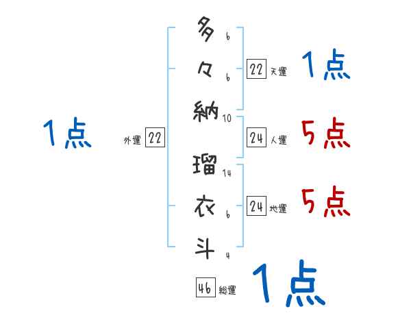 外運![]() | 多々納瑠衣斗さんの外運は22画の1つ星!努力することが苦手ないっぽう手先が器用。芸術性にも優れる。 生活面を象徴する運勢です。外部から受ける影響力を表し、結婚運、家庭運や職場、環境への順応性を表します。 |