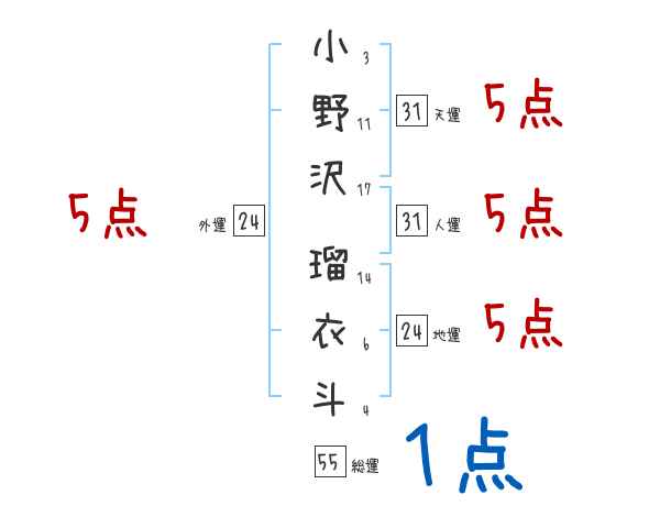 外運![]() | 小野沢瑠衣斗さんの外運は24画の5つ星!家庭運が良く順調な人生。金運にも恵まれる。 生活面を象徴する運勢です。外部から受ける影響力を表し、結婚運、家庭運や職場、環境への順応性を表します。 |