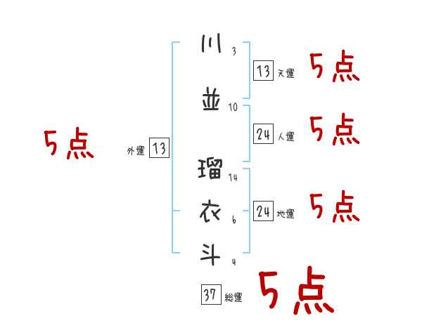 外運![]() | 川並瑠衣斗さんの外運は13画の5つ星!才能に恵まれ人気がある。名声を手に入れる。円満な人生。 生活面を象徴する運勢です。外部から受ける影響力を表し、結婚運、家庭運や職場、環境への順応性を表します。 |