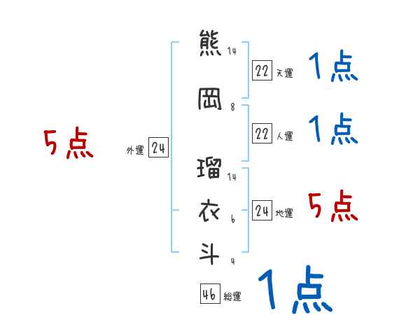 外運![]() | 熊岡瑠衣斗さんの外運は24画の5つ星!家庭運が良く順調な人生。金運にも恵まれる。 生活面を象徴する運勢です。外部から受ける影響力を表し、結婚運、家庭運や職場、環境への順応性を表します。 |