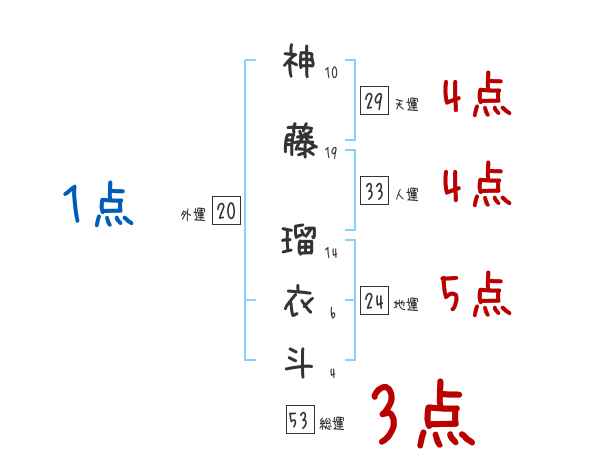 総運![]() | 神藤瑠衣斗さんの総運は53画の3つ星!やや見栄っ張りで虚栄心がある。散財に注意。 あなたの人生を表す1番重要な運勢です。生涯を通じて影響する総合運となり、主に50歳以降の晩年期に影響を及ぼします。 |