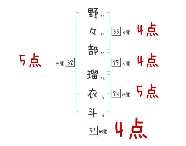 外運![]() | 野々部瑠衣斗さんの外運は32画の5つ星!柔軟性があり成功する。チャンスが多く金運が良い。 生活面を象徴する運勢です。外部から受ける影響力を表し、結婚運、家庭運や職場、環境への順応性を表します。 |