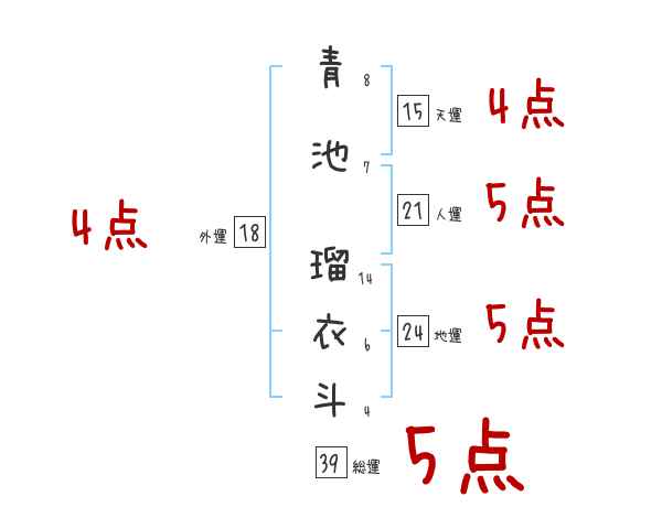 総運![]() | 青池瑠衣斗さんの総運は39画の5つ星!社交性に優れ人望が厚い。人の上に立ち成功する。 あなたの人生を表す1番重要な運勢です。生涯を通じて影響する総合運となり、主に50歳以降の晩年期に影響を及ぼします。 |