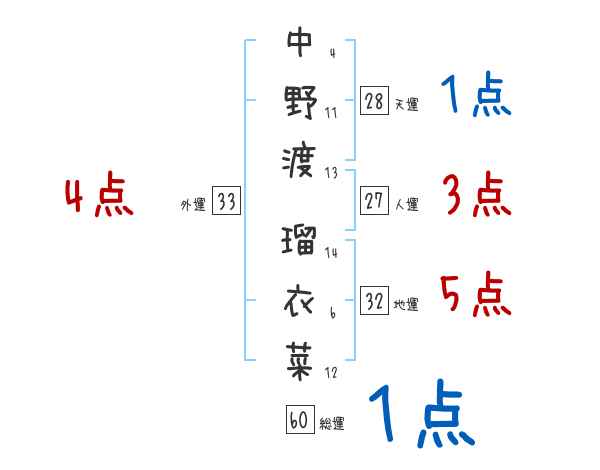 外運![]() | 中野渡瑠衣菜さんの外運は33画の4つ星!権力志向でプライドが高い。勇気があり運を切り開き成功する。 生活面を象徴する運勢です。外部から受ける影響力を表し、結婚運、家庭運や職場、環境への順応性を表します。 |