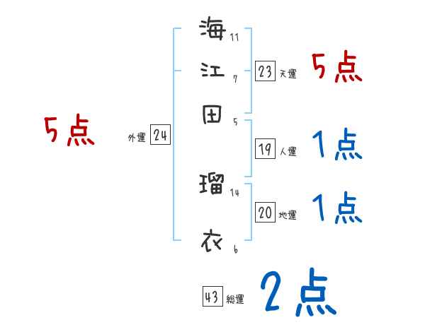 外運![]() | 海江田瑠衣さんの外運は24画の5つ星!家庭運が良く順調な人生。金運にも恵まれる。 生活面を象徴する運勢です。外部から受ける影響力を表し、結婚運、家庭運や職場、環境への順応性を表します。 |