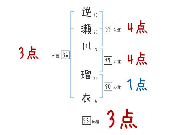 天運![]() | 逆瀬川瑠衣さんの天運は33画の4つ星!権力志向でプライドが高い。勇気があり運を切り開き成功する。 家系が持つ宿命的な運勢を表します。祖先から受け継いだ苗字ですので自分の力が及びません。家柄を象徴します。 |