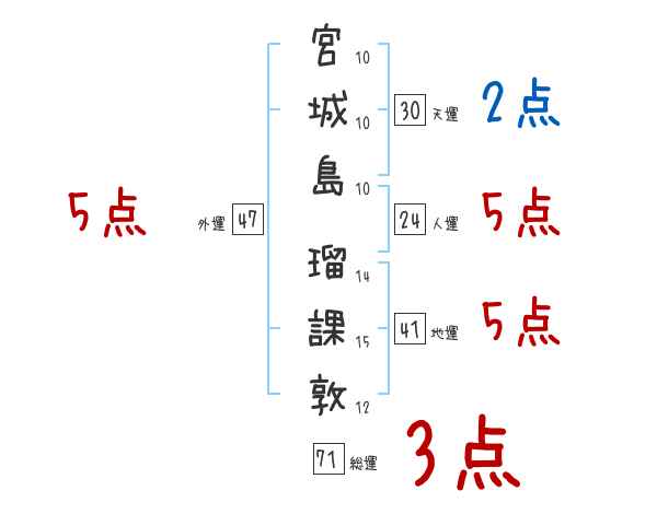 外運![]() | 宮城島瑠課敦さんの外運は47画の5つ星!実力が開花し発展する円満な人生。財に恵まれる。 生活面を象徴する運勢です。外部から受ける影響力を表し、結婚運、家庭運や職場、環境への順応性を表します。 |
