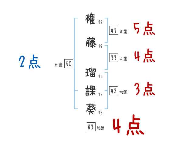 外運![]() | 権藤瑠課葵さんの外運は50画の2つ星!浮き沈みが激しく不安定。しりすぼみに衰退しやすいので注意しましょう。 生活面を象徴する運勢です。外部から受ける影響力を表し、結婚運、家庭運や職場、環境への順応性を表します。 |