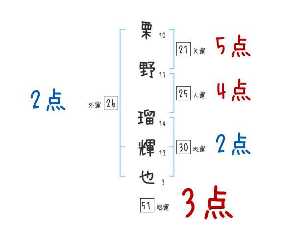 天運![]() | 栗野瑠輝也さんの天運は21画の5つ星!統率力がある。独立し成功する。名誉を手に入れる。 家系が持つ宿命的な運勢を表します。祖先から受け継いだ苗字ですので自分の力が及びません。家柄を象徴します。 |