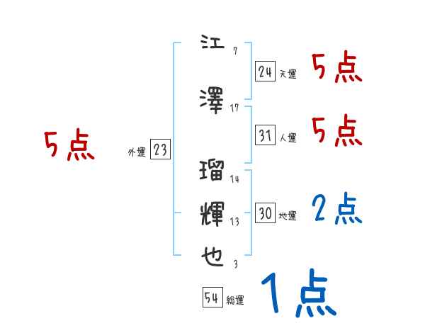 天運![]() | 江澤瑠輝也さんの天運は24画の5つ星!家庭運が良く順調な人生。金運にも恵まれる。 家系が持つ宿命的な運勢を表します。祖先から受け継いだ苗字ですので自分の力が及びません。家柄を象徴します。 |