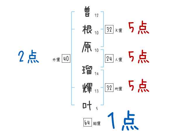 天運![]() | 曽根原瑠輝叶さんの天運は32画の5つ星!柔軟性があり成功する。チャンスが多く金運が良い。 家系が持つ宿命的な運勢を表します。祖先から受け継いだ苗字ですので自分の力が及びません。家柄を象徴します。 |