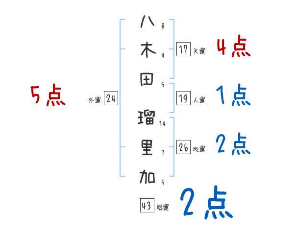 総運![]() | 八木田瑠里加さんの総運は43画の2つ星!頑固な性格で独立心が強いかも。やや非現実的で浪費に注意しましょう。 あなたの人生を表す1番重要な運勢です。生涯を通じて影響する総合運となり、主に50歳以降の晩年期に影響を及ぼします。 |