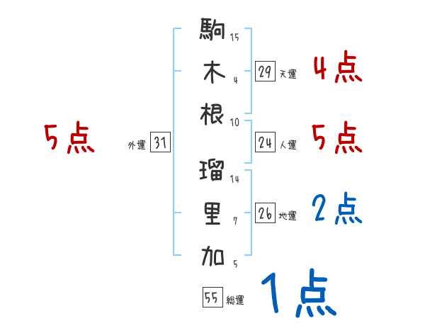 天運![]() | 駒木根瑠里加さんの天運は29画の4つ星!完全主義で才能がある。厳格な心の持ち主。 家系が持つ宿命的な運勢を表します。祖先から受け継いだ苗字ですので自分の力が及びません。家柄を象徴します。 |