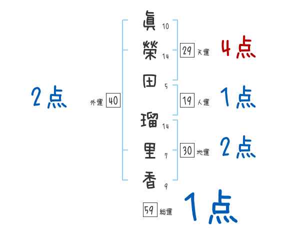天運![]() | 眞榮田瑠里香さんの天運は29画の4つ星!完全主義で才能がある。厳格な心の持ち主。 家系が持つ宿命的な運勢を表します。祖先から受け継いだ苗字ですので自分の力が及びません。家柄を象徴します。 |