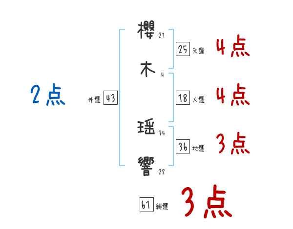 天運![]() | 櫻木瑶響さんの天運は25画の4つ星!個性があり才能があふれる。強運の持ち主で発展する。 家系が持つ宿命的な運勢を表します。祖先から受け継いだ苗字ですので自分の力が及びません。家柄を象徴します。 |