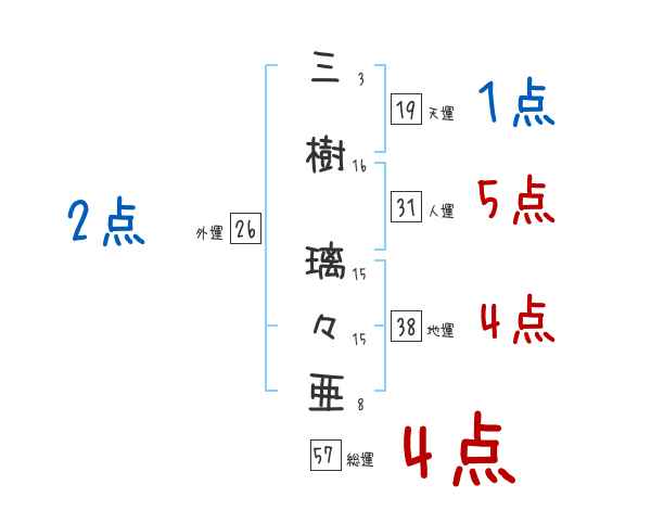 外運![]() | 三樹璃々亜さんの外運は26画の2つ星!波瀾万丈かも。信頼できる人を大事にしましょう。 生活面を象徴する運勢です。外部から受ける影響力を表し、結婚運、家庭運や職場、環境への順応性を表します。 |