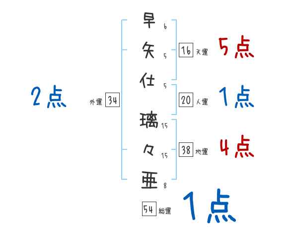 天運![]() | 早矢仕璃々亜さんの天運は16画の5つ星!人望が厚く大きく発展する。逆転成功が見える。 家系が持つ宿命的な運勢を表します。祖先から受け継いだ苗字ですので自分の力が及びません。家柄を象徴します。 |