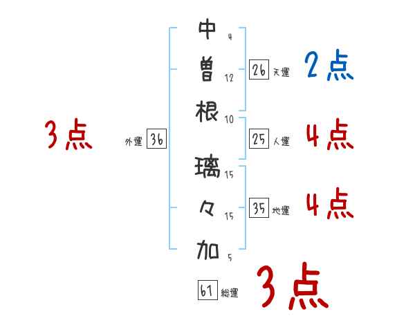 外運![]() | 中曽根璃々加さんの外運は36画の3つ星!先見性が豊かです。多少神経質で苦労することも。 生活面を象徴する運勢です。外部から受ける影響力を表し、結婚運、家庭運や職場、環境への順応性を表します。 |